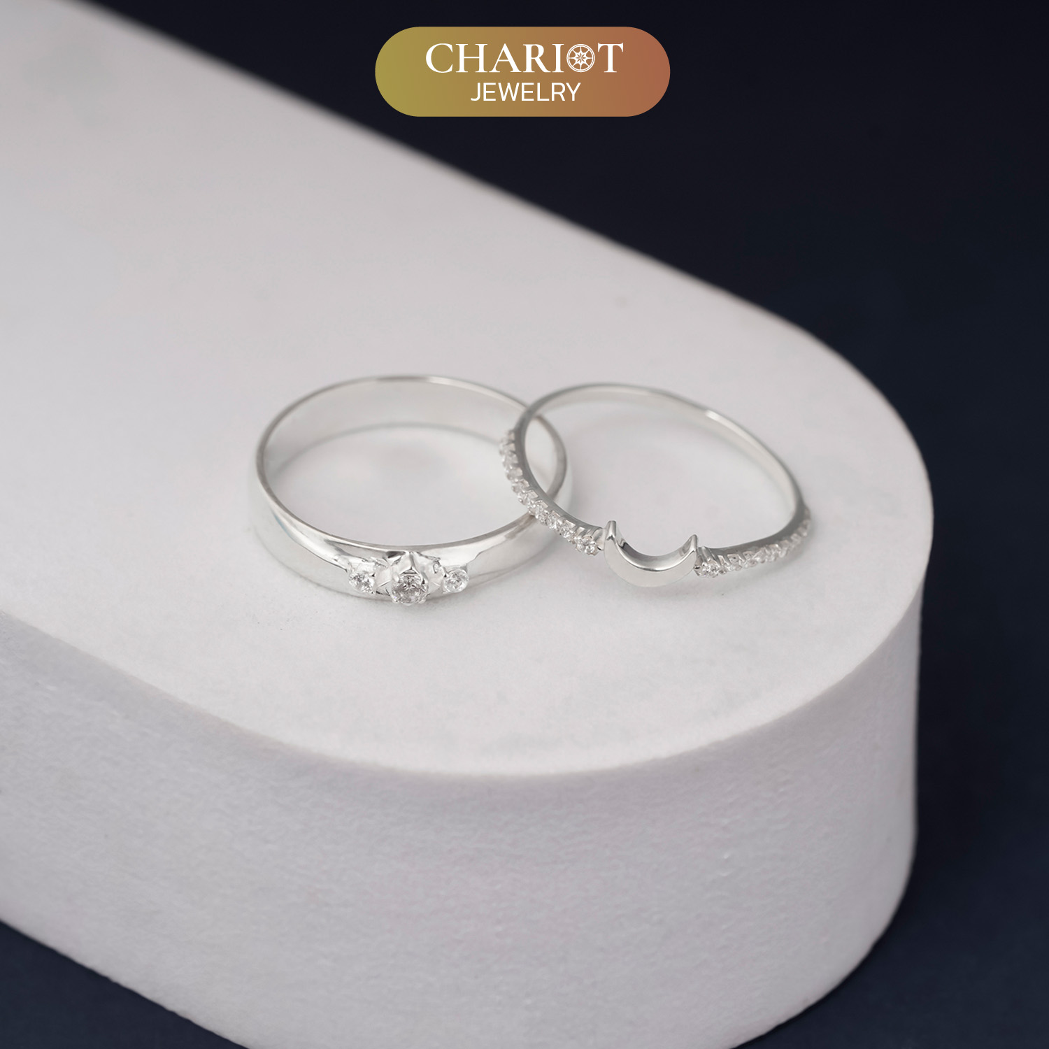 The unique design features a men’s ring adorned with a star motif, symbolizing guidance and protection. The women’s ring is softer, highlighted by a sparkling crescent moon and small cubic zirconia stones, representing gentleness and radiance. The harmonious combination of these designs evokes the imagery of the moon and stars, always accompanying and shining together.