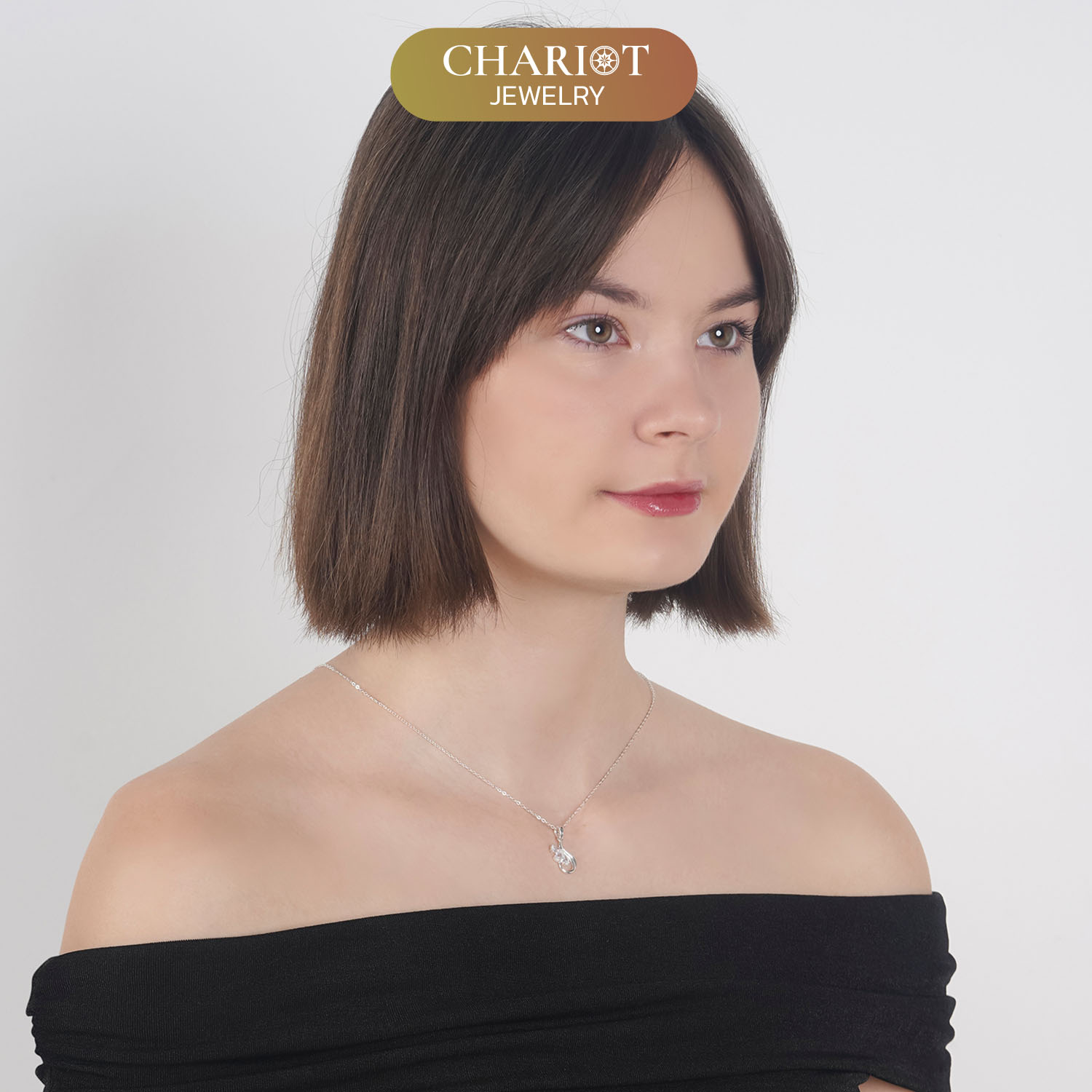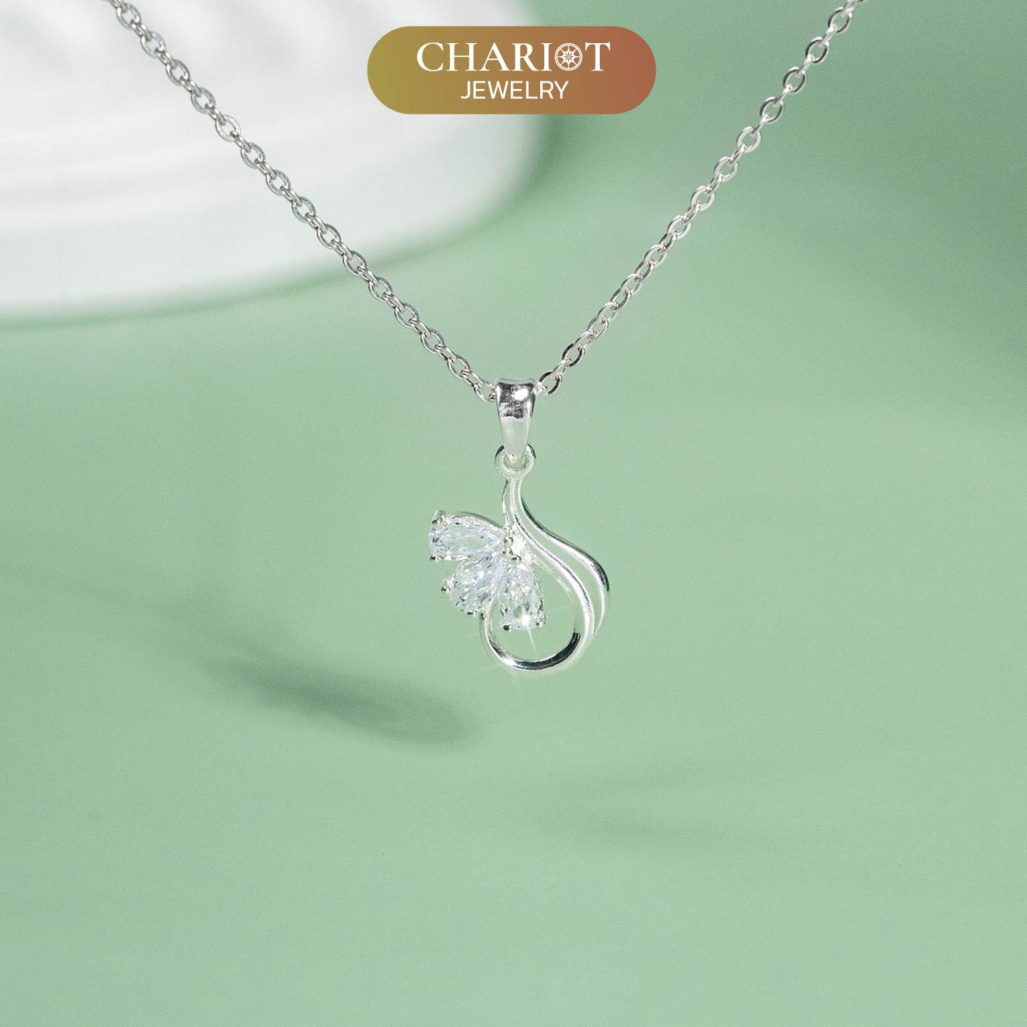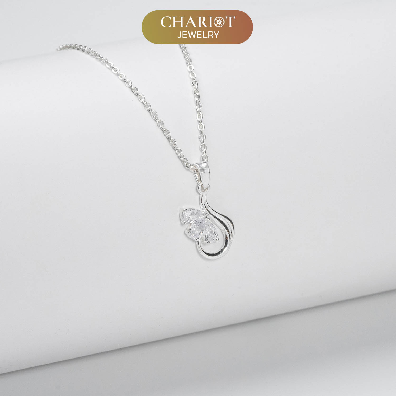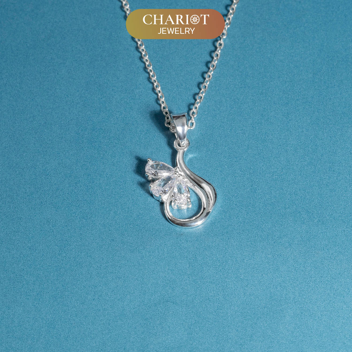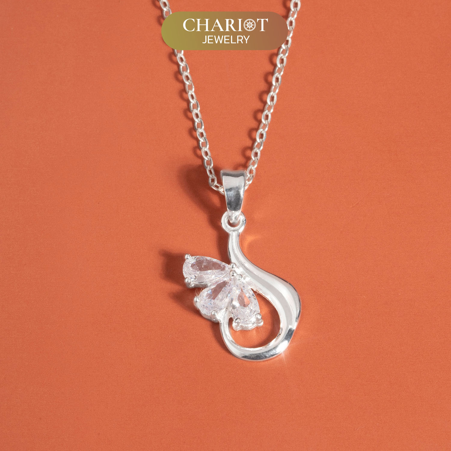 The pendant features a stylized droplet design, reminiscent of dreamy dewdrops glistening in the morning light. The captivating highlight is the meticulous placement of three cubic zirconia stones, creating a dazzling layer of sparkle and allure. The interplay of the droplet’s natural beauty and the cubic zirconia stones’ shimmering brilliance creates an impressive and elegant aesthetic.
