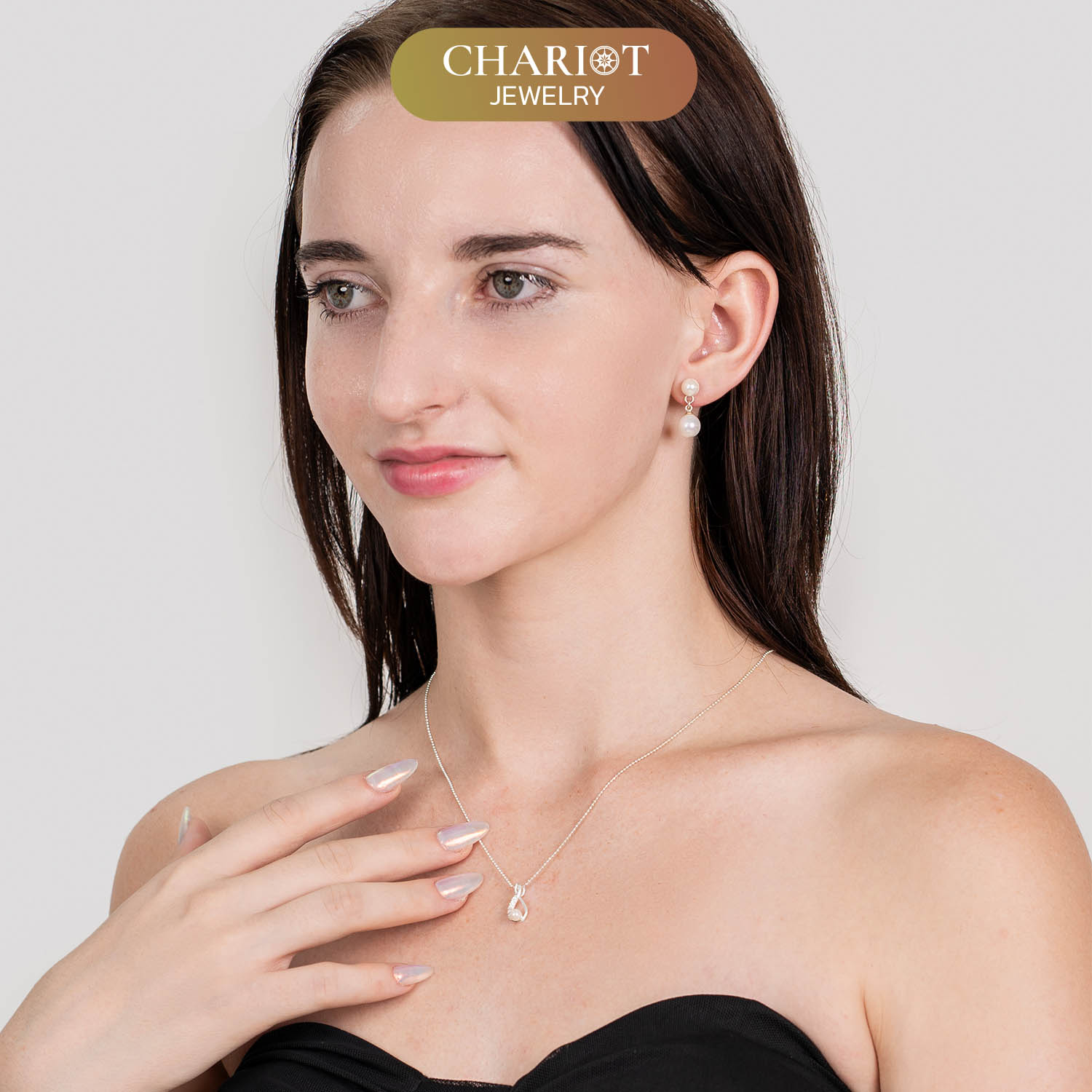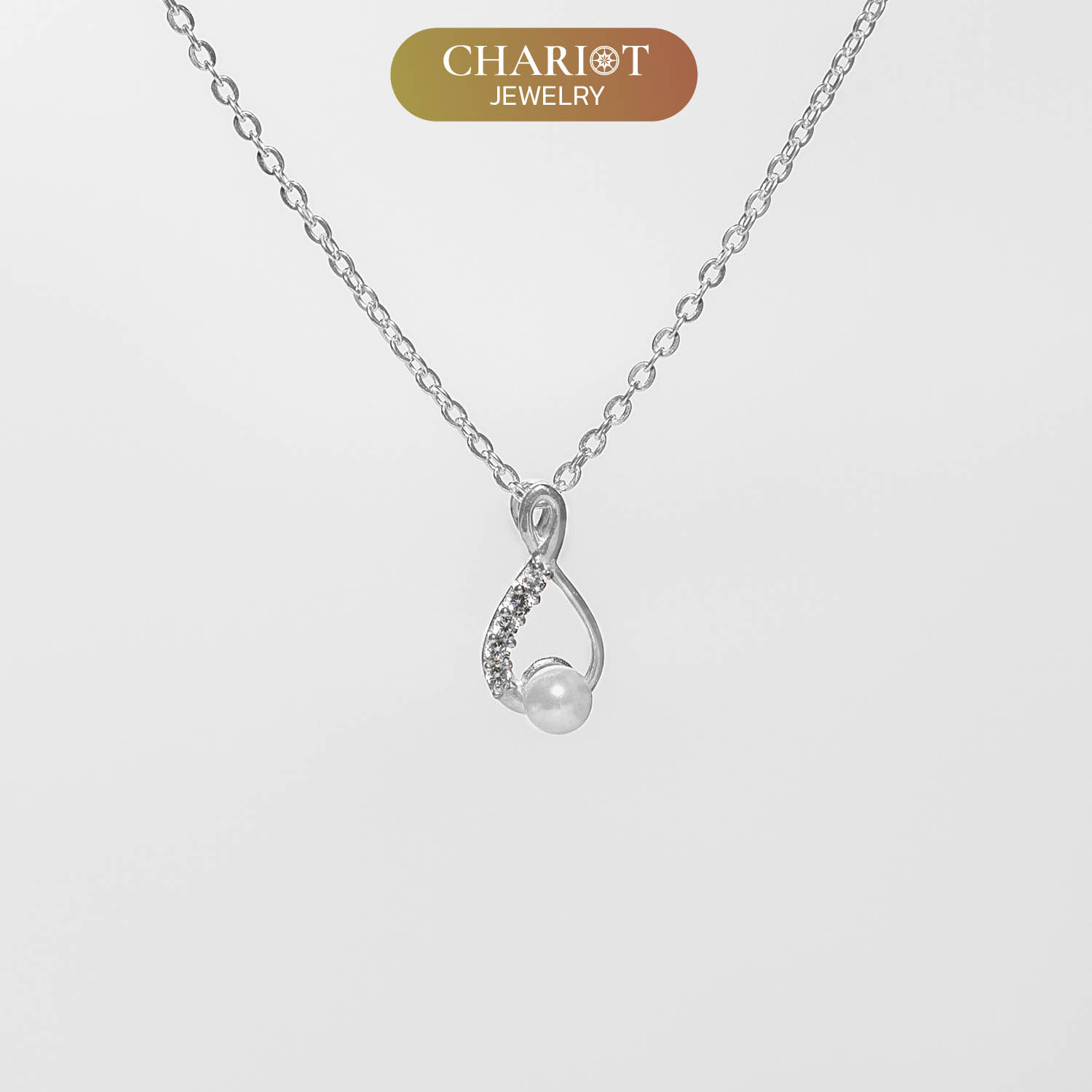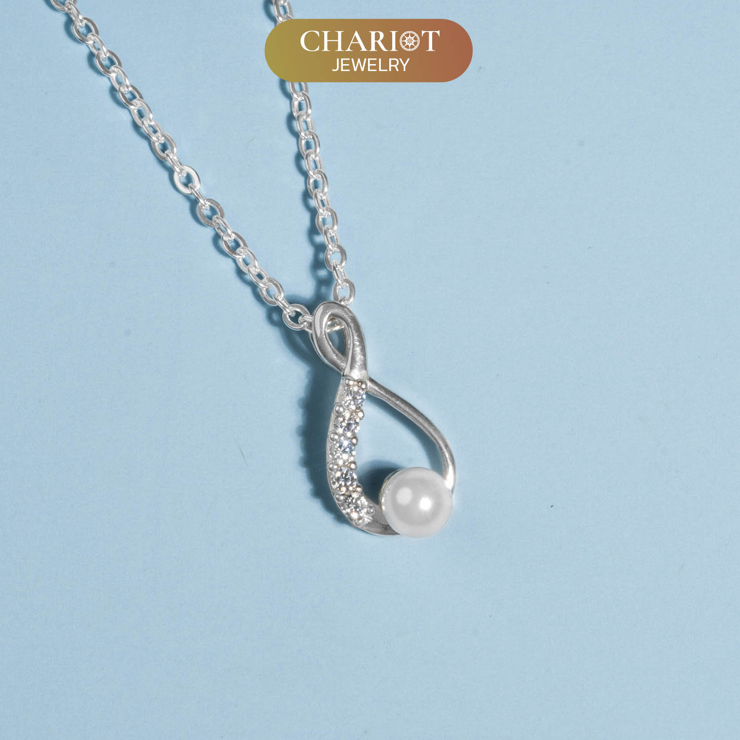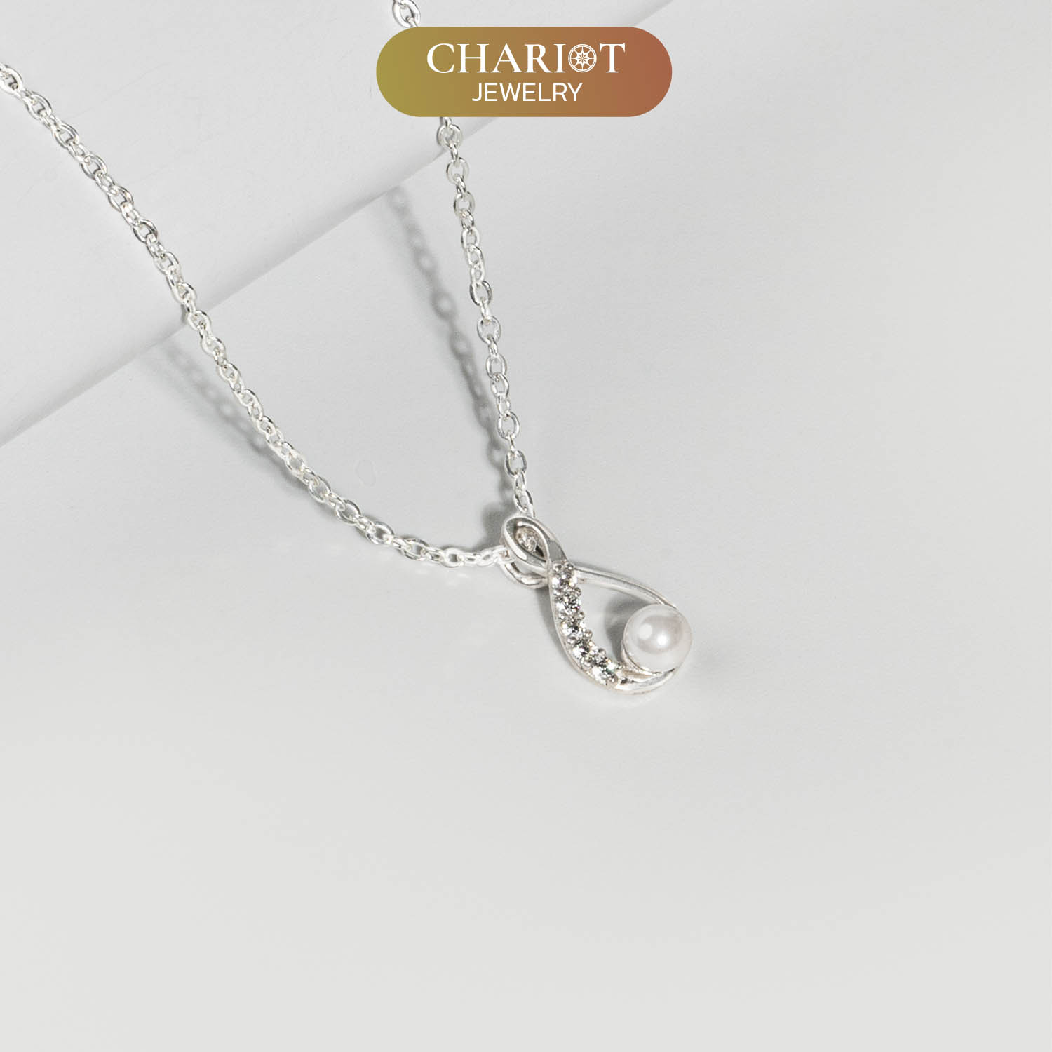 The pendant is made of high-quality sterling silver imported from Italy and adorned with cubic zirconia stones and a single freshwater pearl.